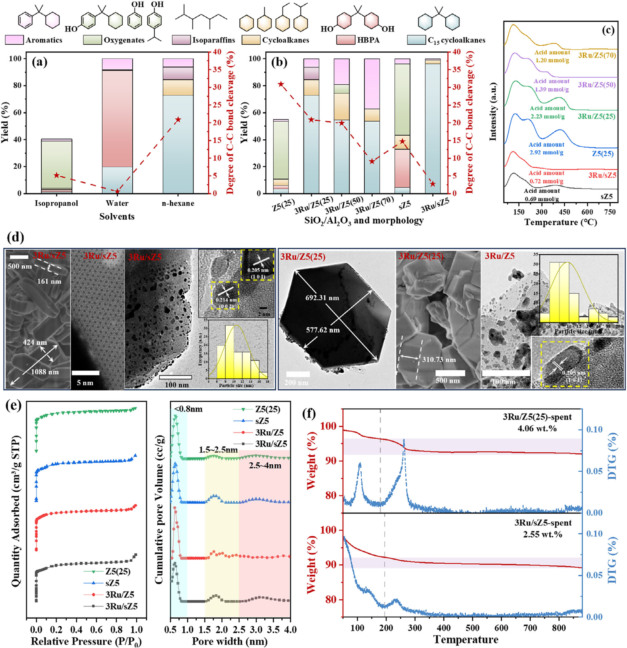 现在,废旧风机叶片、线路板中环氧树脂热解衍生的高碳数酚类难以高质利用。将高碳数酚类化合物(如双酚A)加氢脱氧为多环烷烃能有效提升燃料的能量密度,但该过程面临着抑制C-C键断裂和催化剂结焦的挑战。传统的微孔分子筛由于对大分子的传质能力有限,容易促进孔内发生二次副反应并导致结焦。为解决这一问题,研究团队设计并制备了一种负载钌的短介孔纳米片ZSM-5催化剂,该结构显著提高了反应物与金属/酸性位点接触的可及性,并加速了高碳数酚类物质的扩散。实验结果表明,该独特的纳米片结构结合适宜的布朗斯台德酸度,实现了由双酚A向2,2-二环己基丙烷的高效转化,产率达96.30%,同时有效抑制了C-C键的断裂和催化剂结焦。此外,研究团队利用环境透射电镜捕捉了Ru金属在原子尺度的瞬时变化,并结合密度泛函理论计算,揭示了其在不同加氢反应阶段的动态演变规律。该加氢脱氧(HDO)策略及机制探究为抗结焦催化剂的设计及在高碳数酚类化合物HDO过程中避免C-C键断裂给予了新思路,可广泛应用于废树脂和木质素热解产物的高效转化。